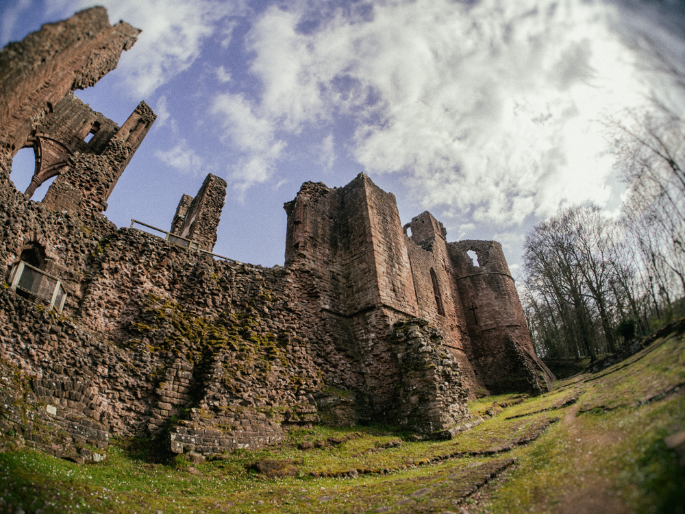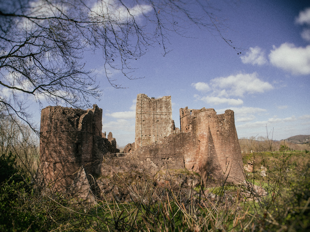 Goodrich CastleFrom the location of the former stables, inside the outer curtain wall. The castle was ruined by Cromwell’s Army who attacked the beseiged Parliamentarians from the corner shown.Inside the South West Tower