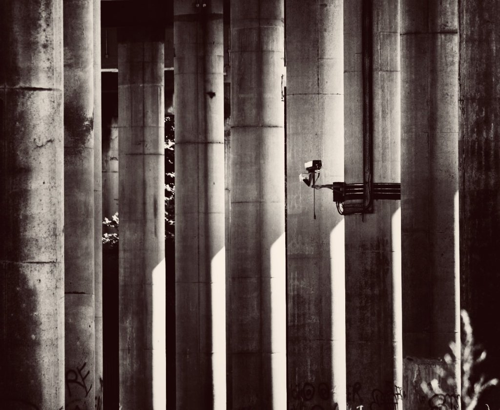 sun sneaks into shade/concrete columns hold up sky/keeping watch below